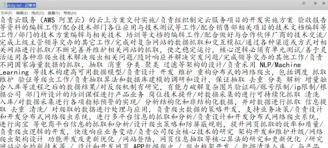 访问招聘信息详情页面,获取职位描述(岗位职责和岗位要求)并清理数据: