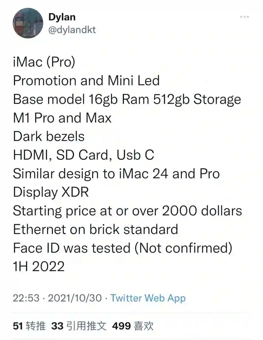 Dylandkt 还表示,iMac Pro 的起价将达到或超过 2000 美元,并将于 2022 年上半年推出。此款 iMac Pro 或将取代目前基于英特尔芯片的 27 英寸 iMac 机型。彭博社的 Mark Gurman 目前也已证实 iMac Pro 正在研发当中,苹果目前的重心在 24 英寸的 iMac 身上,结束研发 24 英寸 iMac 后将会继续其他工作。