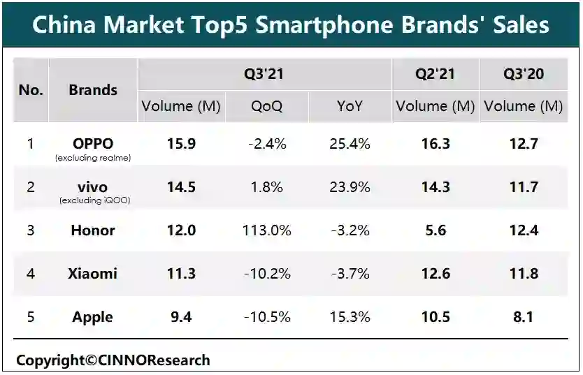 CINNO分析主要原因有两个方面:一方面因市场等待三季度新机发布,市场对安卓机持观望态度,消费需求延后;另一方面因去年疫情之后市场快速复苏带来的同期高基数。随着苹果新品 iPhone13 系列及其他安卓新机的陆续上市,叠加 “11·11” 促销季的到来,四季度有望达全年销量高峰。