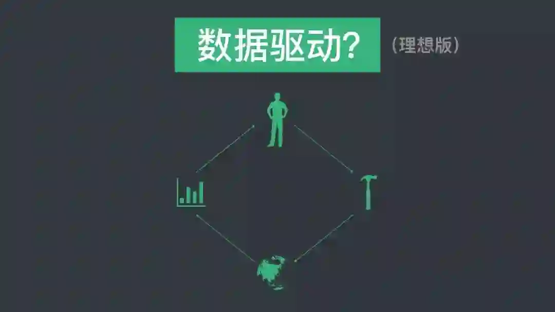 数据驱动特别简单,总结起来就是四步。产品经理想了一个方法,把方法推到市场上,从市场上把数据回收回来,回收回来再观察数据。做下一个决策 。这是理想版