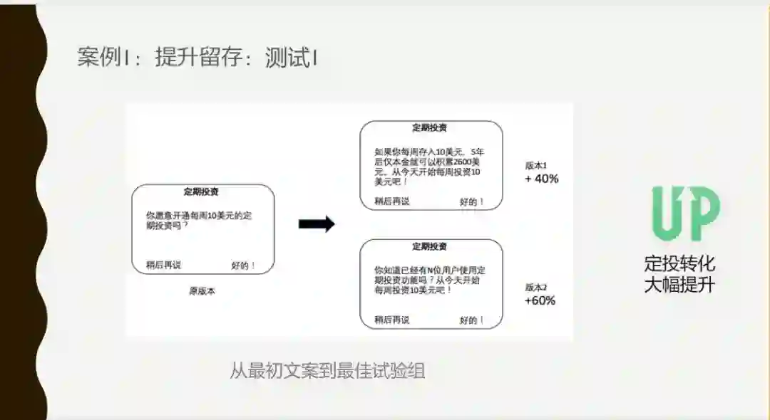 提高留存你需要找到导致留存的行为,留存是一个结果。你没办法直接改善结果,所以你需要找到它的原因。在 Acorns 里,我们其实看到定投这个功能和留存的相关性,我们做了实验是提高了定投,我们回过头去看留存真的改善了,这就证明了他们的因果性。