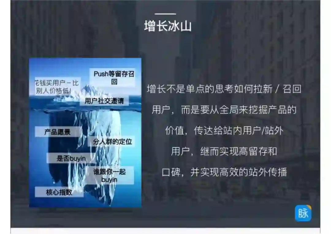 增长我们能看到的是冰上我们可以看到的东西,但是本质上其实是产品愿景、分人群的定位。最关键的是你是否认可这个产品,你的增长团队是否认可这个产品。