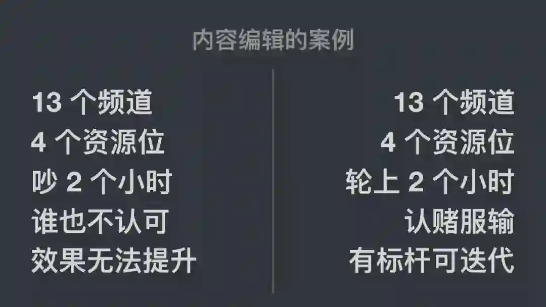 我之前在某内容网站工作的时候,这个网站有 13 个内容频道,4 个资源位,编辑都想让自己的内容上到资源位去,每天都为这个争吵。为了解决争吵这个问题,我当时就把 10-12 点 2 个小时分成 8 个时间段所有编辑的内容轮流上,到 12 点来拉数据看谁的 CTR (Click-Through-Rate)和点进去视频播放数高,那接下来一天12-次日10点就谁的内容上推荐位。