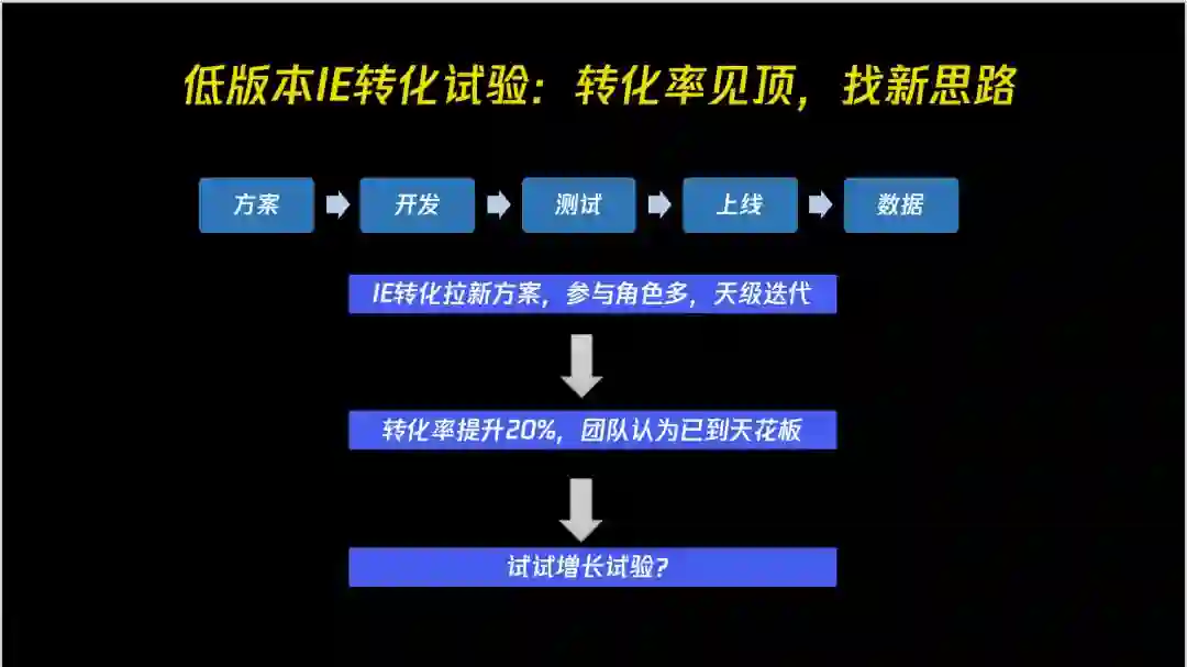 这之后我们又开始做了很多的测试。IE 的低成本获客之后,成为了我们的主获客渠道。后来我让团队里的产品和运营的同学去继续优化这个产品这个时候转化率已经提升到 20%,整个转化率已经见顶了。这个时候大家在想寻找增长杠杆已经到底,但是在增长黑客比较核心的实验我们还没开始做起来。