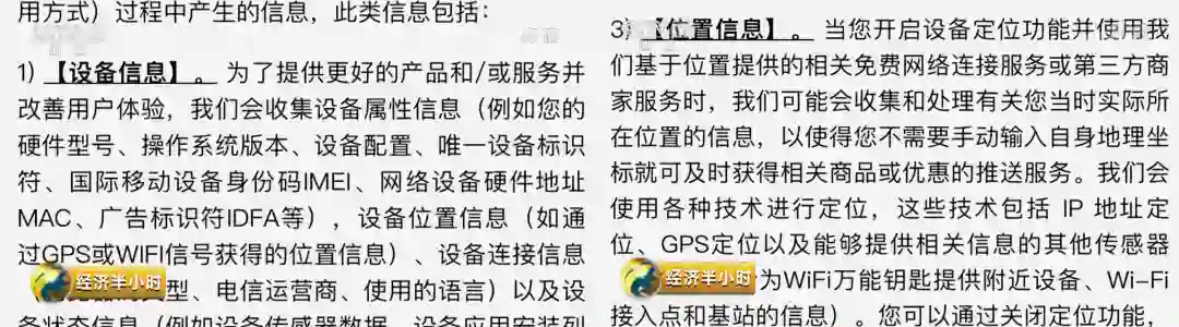 应用的右下角有一行非常小的蓝色字体《Wi-Fi万能钥匙用户协议》,点击立即体验时,就等同你默认了这个用户协议。而Wi-Fi万能钥匙在这个用户协议当中,有一项隐私政策的声明,里面描述了“它会如何收集和使用消费者的个人信息及其他信息”。这些信息包括最基本的用户使用手机的设备信息;使用服务器的IP地址;GPS定位等等。而最为关键的一点是Wi-Fi万能钥匙需要共享、转让、公开披露用户的个人信息,只有这样才能实现这个产品所谓的“核心服务功能”。