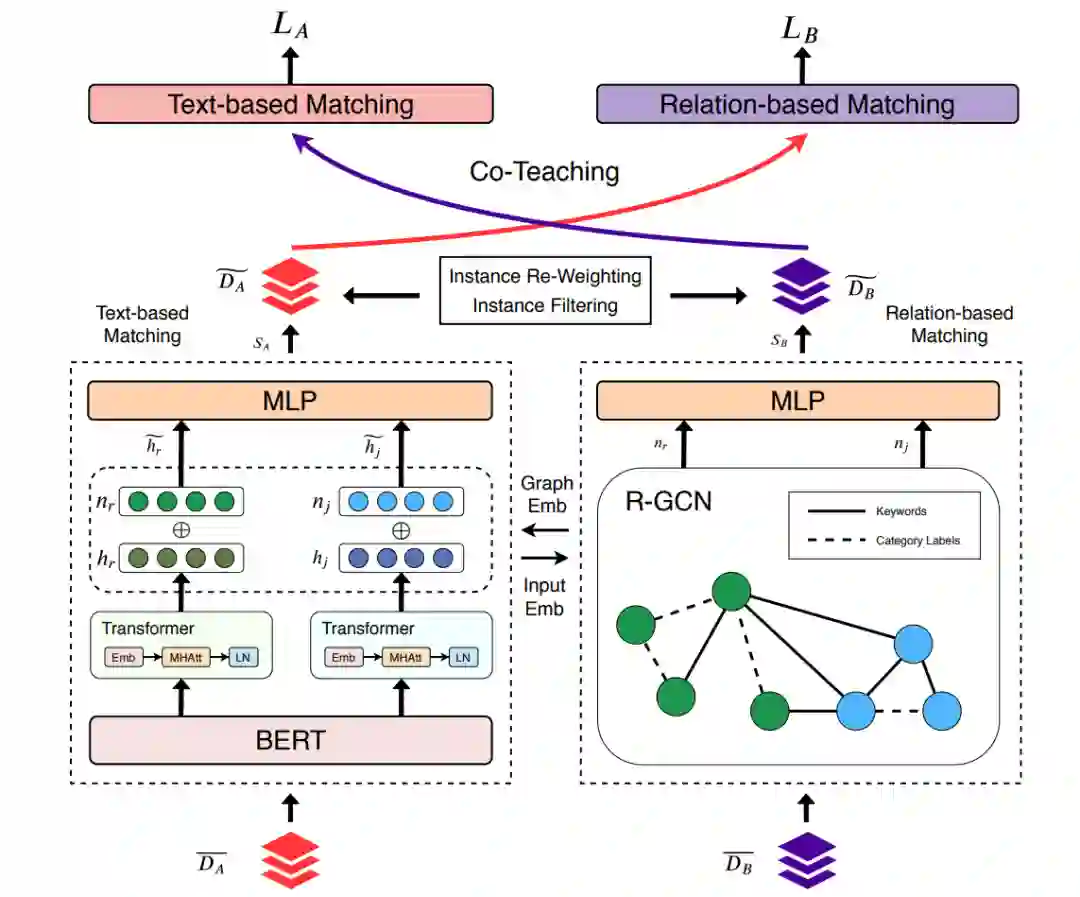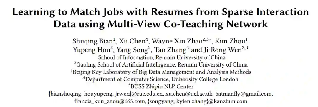 本届CIKM会议共收到920篇论文投稿,其中录用论文193篇,录取率约为21%。而在众多论文当中,一篇BOSS直聘和中国人民大学联合发表的基于多视图协作学习的人岗匹配研究吸引了我们的注意力。论文题目:《Learning to Match Jobs with Resumes from Sparse Interaction Data using Multi-View Co-Teaching Network》。论文链接:https://arxiv.org/abs/2009.13299本论文针对求职者和招聘方的交互行为数据稀疏且带有噪声这一场景,基于多视图协作学习,提出了一个新型匹配模型。新型模型相比以往模型,增加了基于关系的匹配模块,且将两个匹配模块融合进行协作训练,优化了该场景下的人岗匹配效率。CIKM大会评审反馈,该论文提出的多视图协作学习网络能够解决人岗匹配系统的负样本噪声问题。同时,融合文本匹配模块和关系匹配模块进行的联合表示学习有助于解决双边交互行为数据稀疏问题,突破了以往匹配模型需要大量有效样本数据的限定条件。而该思路对于互联网求职招聘场景以外领域的推荐系统研究也有一定指导意义。