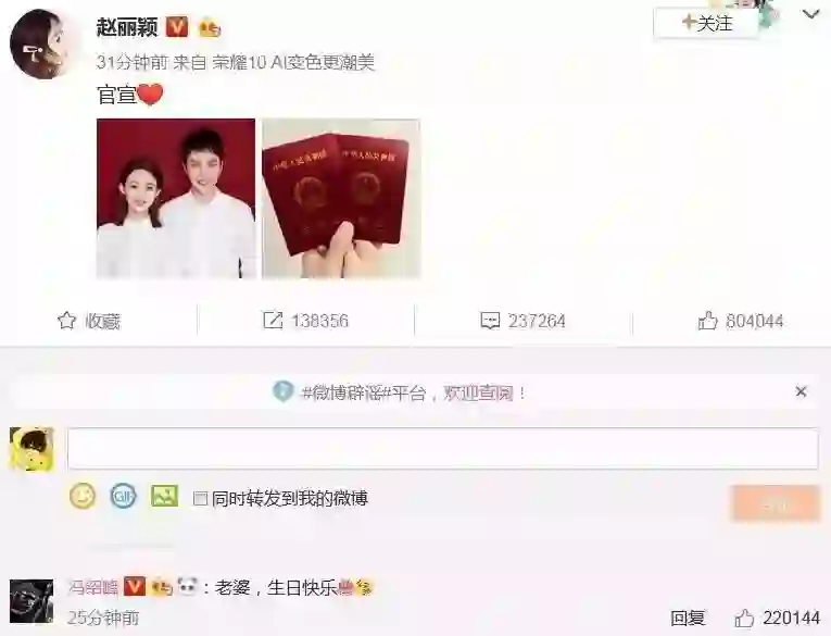 另外有趣的是,犀利的网友发现,一家手机厂商或许能趁着赵丽颖冯绍峰宣布结婚的微博来赚一波广告......