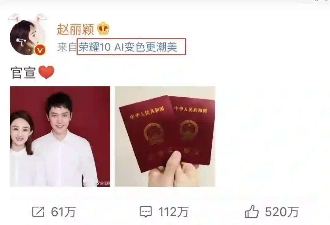 网友们注意到,双方公开婚照所发微博都拖着一个小尾巴,其中赵丽颖的是“荣耀10 AI变色更潮美”,这正是赵丽颖所代言的手机品牌。