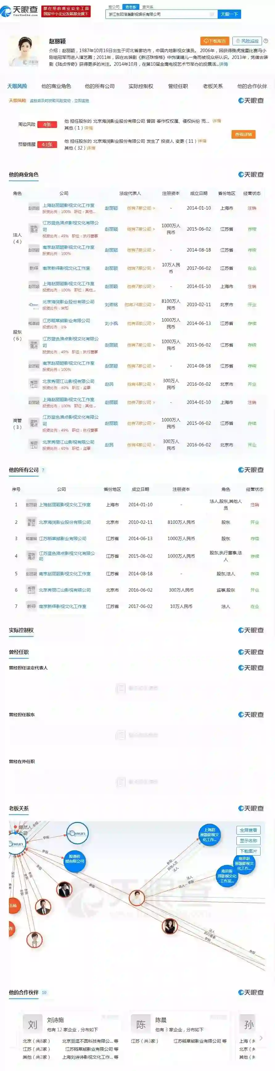 此外,赵丽颖还在北京海润影业股份有限公司、江苏稻草熊影业有限公司、北京秀丽江山影视有限公司等5家未注销公司担任股东。