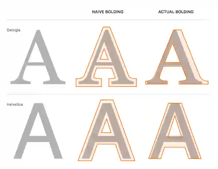 正如你所见,无论是在有衬线的情况下,还是在无衬线的情况下,幼稚的加粗程序都产生了很不一样的结果。例如,在Georgia字体中,左侧的笔划只是略微加粗,右侧的笔划则明显加粗了,但只加粗了一侧。在这两种字体中,加粗不会改变字体的高度,而幼稚方法却改变了高度。