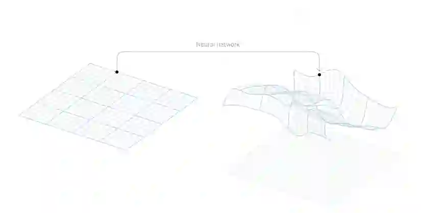 我们通过构建一个神经网络来完成这个任务,这个神经网络需要一些输入变量(数量不大),这些输入被称为潜变量(latent variables),并产生整个字形作为输出。我们使用的具体模型有40个潜在的空间维度,将其映射到4096维空间可以描述字形中所有的像素。换句话说,这个想法是将一个低维空间映射到一个高维空间: