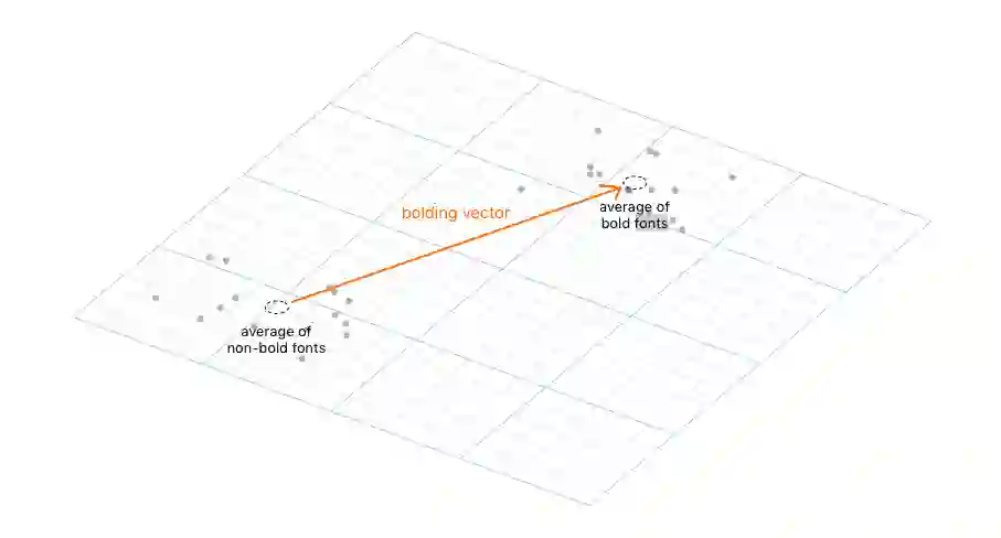 回到生成式模型的基本细节,我们如何使用这样的模型来制作类似于前文所示的基于样例进行推理的工具呢?我们来考虑一下加粗工具的情况。在这种情况下,我们接受用户指定的粗体字体的所有潜向量的平均值,和所有用户指定的非粗体字体的平均值。接着我们计算这两个平均向量之差: