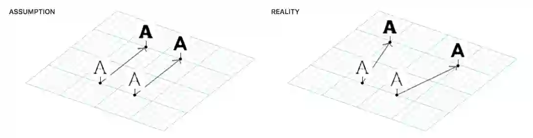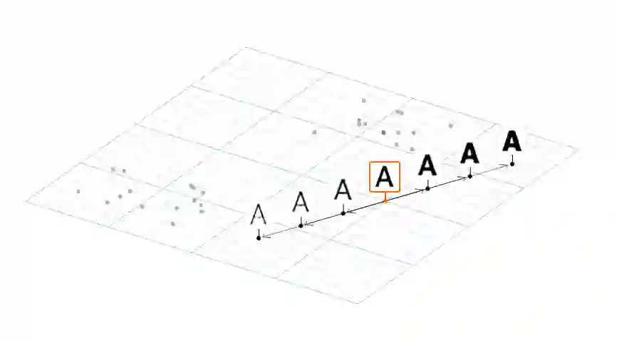 为了让需要接受任意初始字体的属性向量有效,我们可以通过在隐空间这加上同一向量构建相应的粗体。然而,我们可以推理得到,没有理由使用一个单一的常量向量进行位移会有效。我们可能需要进行许多不同的位移。例如,用于加粗衬线字体和无衬线字体的启发有很大不同,因此看起来会涉及到非常不同的位移: