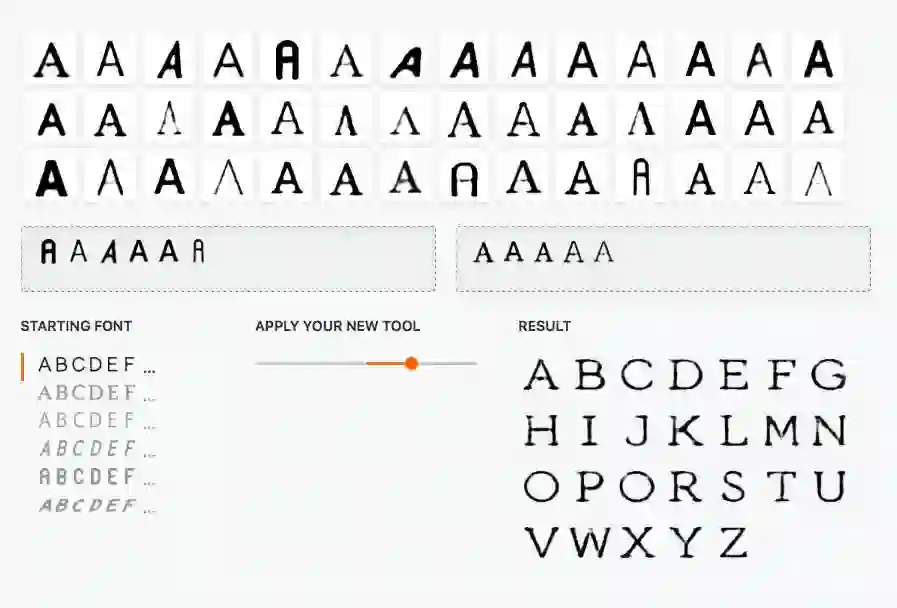 我们来看一个机器学习模型使得新型接口成为可能的例子。为了理解这个界面,你可以想象自己是一个字体设计师,正在创建一个新字体。(我们会很过分地不顾字体和字型的区别。向任何可能正在阅读本文的字体设计师致歉。)草绘一些初步的设计后,你想试下粗体、斜体和长体这样的变体。让我们来看看一个从初始设计中生成和探索变体的工具。结果的质量是相当粗糙的,稍后将解释具体原因,请多多包涵。