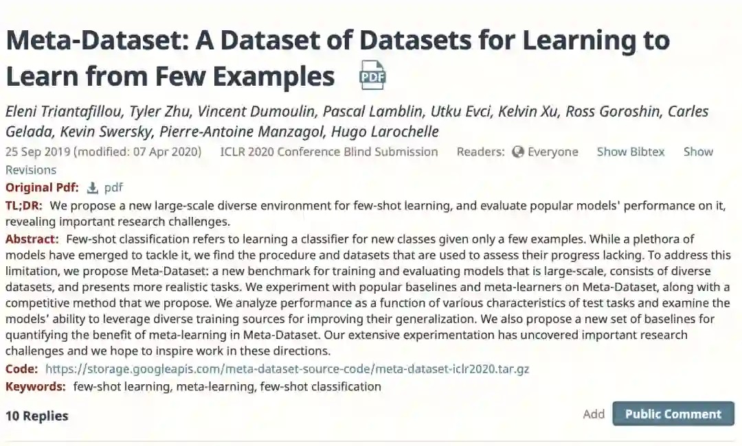 而 Google 在 ICLR2020 就发布了他们在少样本学习的新成果:「元数据集:学会从少样本中学习的数据集」,下面是论文链接: