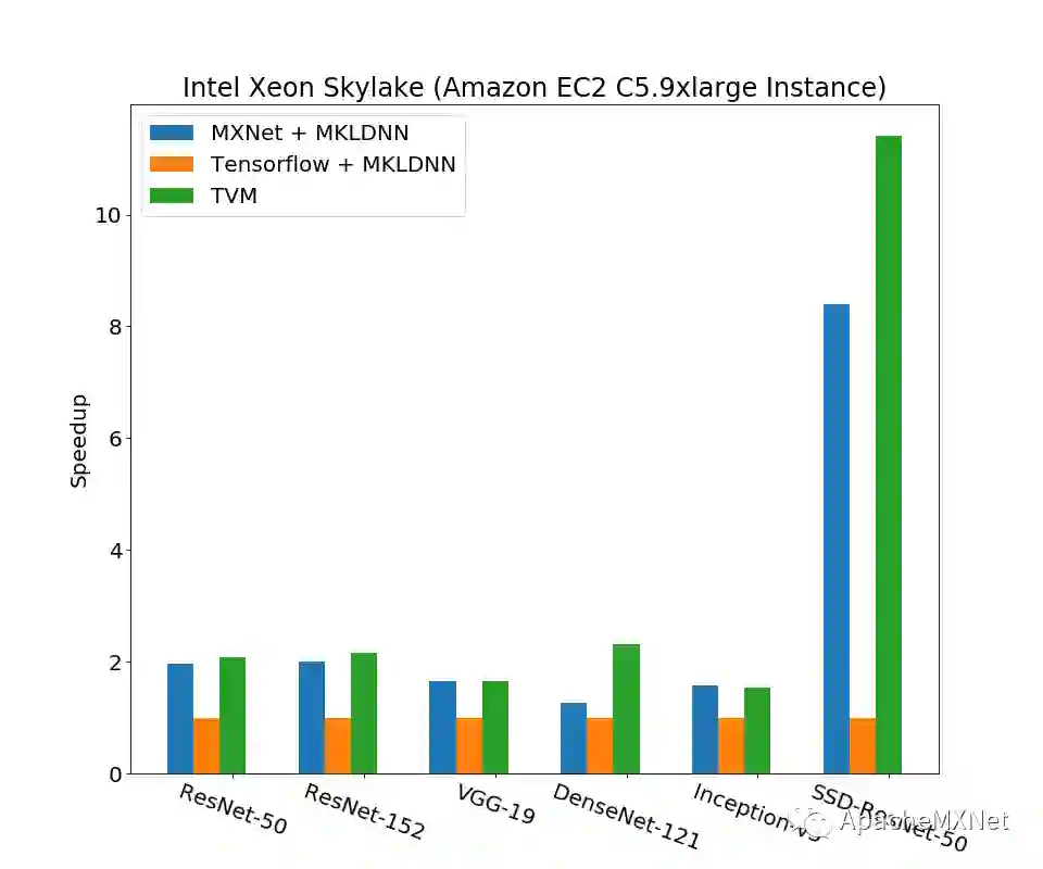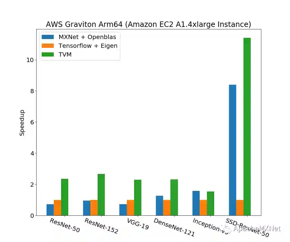 当时(现在也是)功能最全社区活跃度最高的开源深度学习编译器是TVM,它可以接受不同框架(Keras/MXNet/TensorFlow/...)的模型并编译到多种设备(CPU/GPU/FPGA/...)上。由于TVM的编译做了不同粒度的优化,在端到端(end-to-end)性能上有时甚至能得到几十倍的加速。TVM发起于华盛顿大学(当时的)在读博士生陈天奇,AWS AI从一开始就在活跃地参与这个开源项目,一直都是TVM社区最大一股的工业界力量。