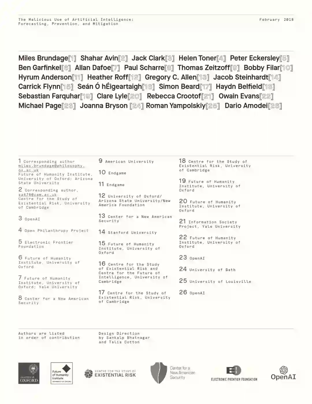 这份报告由来自剑桥大学、牛津大学与耶鲁大学的26位科技与公共政策学者共同发表,对社会发出警告: 行事草率的政府、罪犯、或个人都有可能会滥用这项科技。