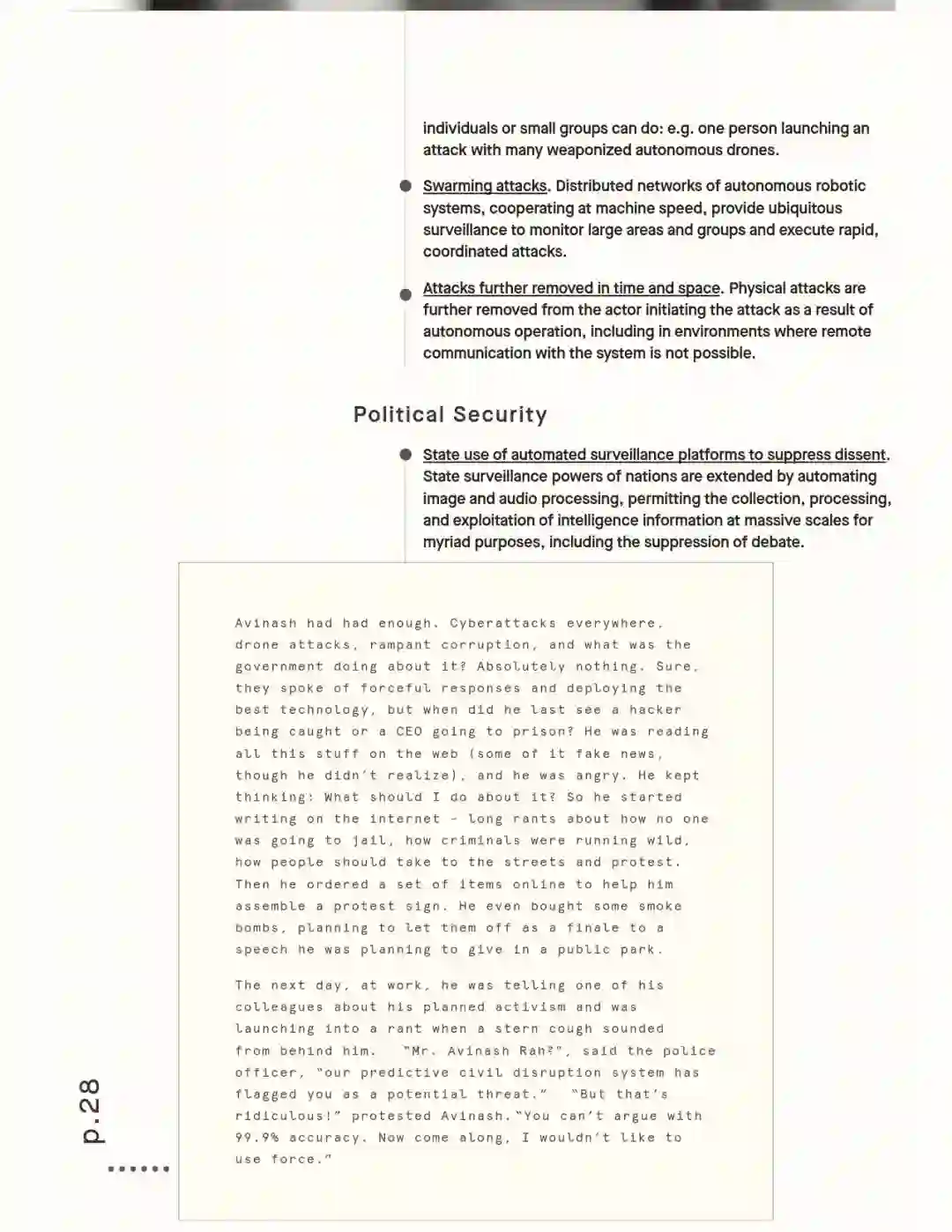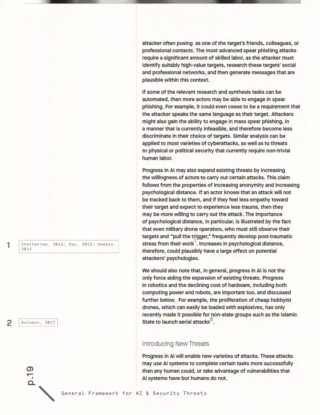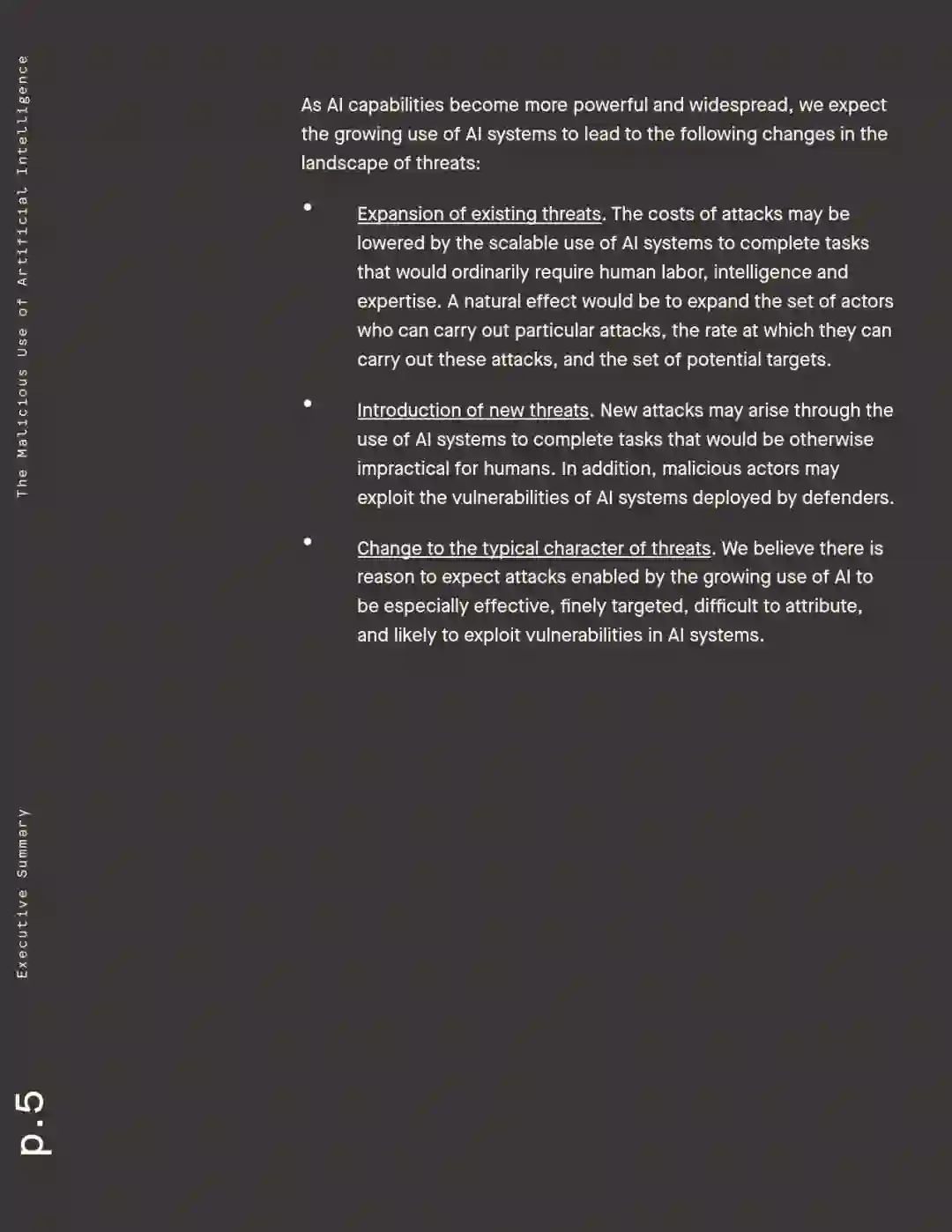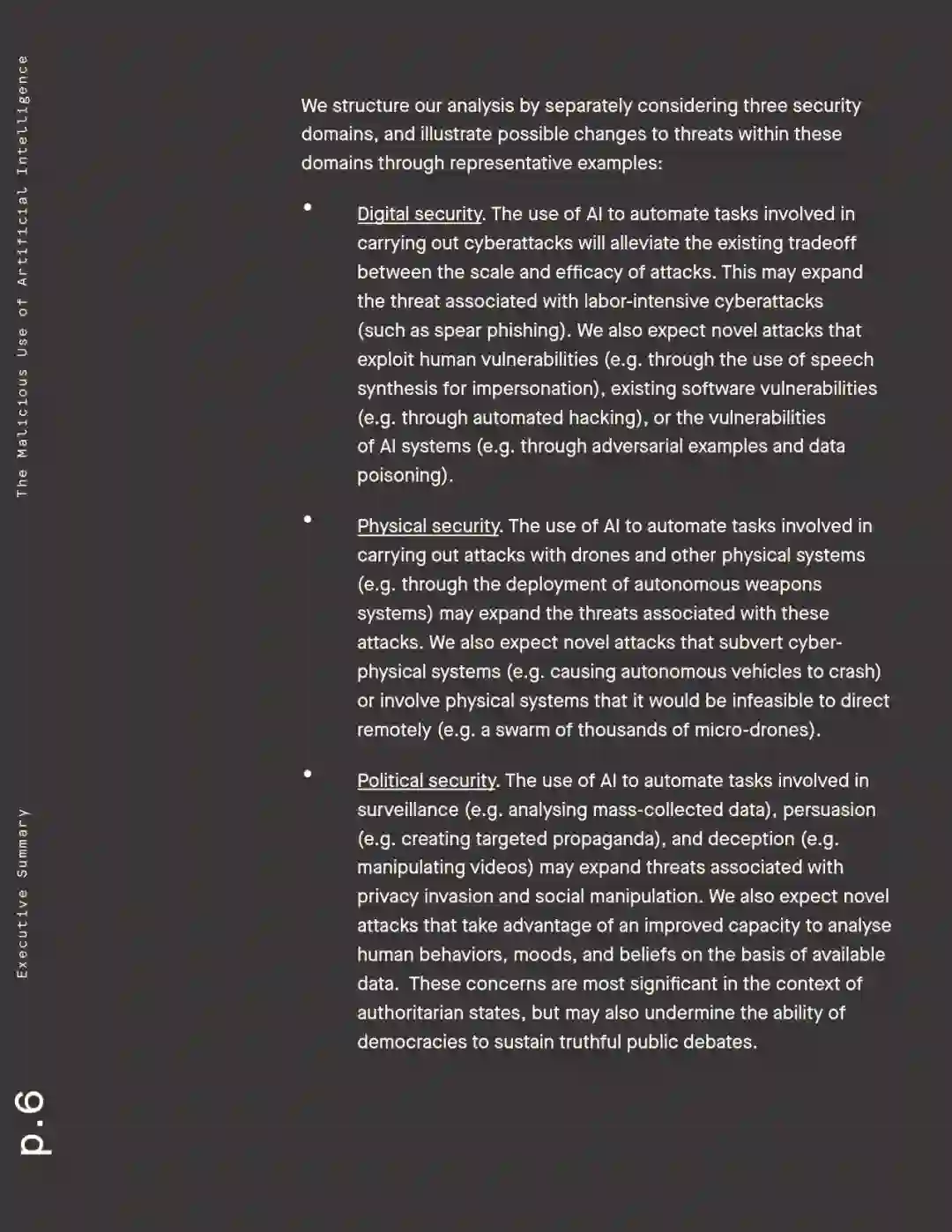 报告中提到,人工智能一旦被恶意操作,它能够采取大规模的高精准锁定攻击,不管是资讯的还是政治的安全都会面临即刻的威胁。报告中特别强调,这些是针对该领域未来五年内可能的发展所下的结论。