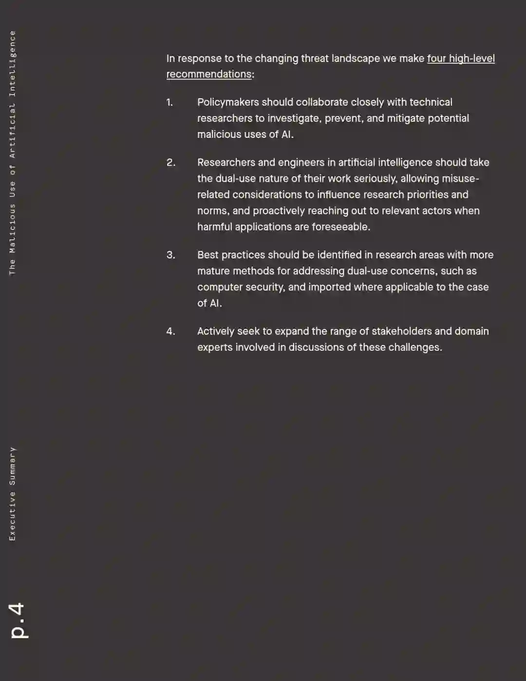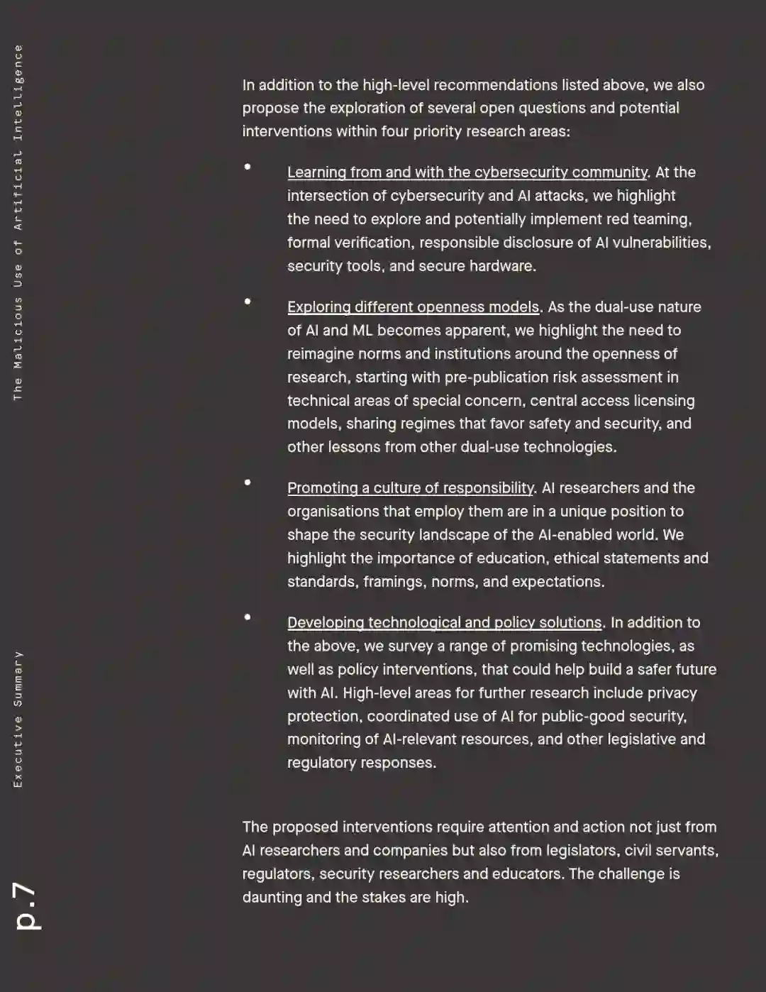 最后,这份报告提出一系列建议,包括将人工智能视为 "军事兼商业"科技加以管制。它也呼吁人工智能界的学者,要对发表他们的研究成果保持谨慎,静待其他学者研拟出因应风险的办法。这位学者也坦陈,"最终,我们发现的问题比能解决的多。"