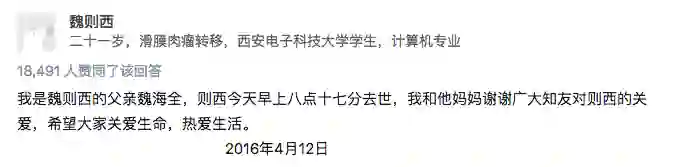 2016年4月12日,在知乎帖“魏则西怎么样了?”下面,一位父亲写下这样一句话,描述了自己年仅22岁儿子的离开。