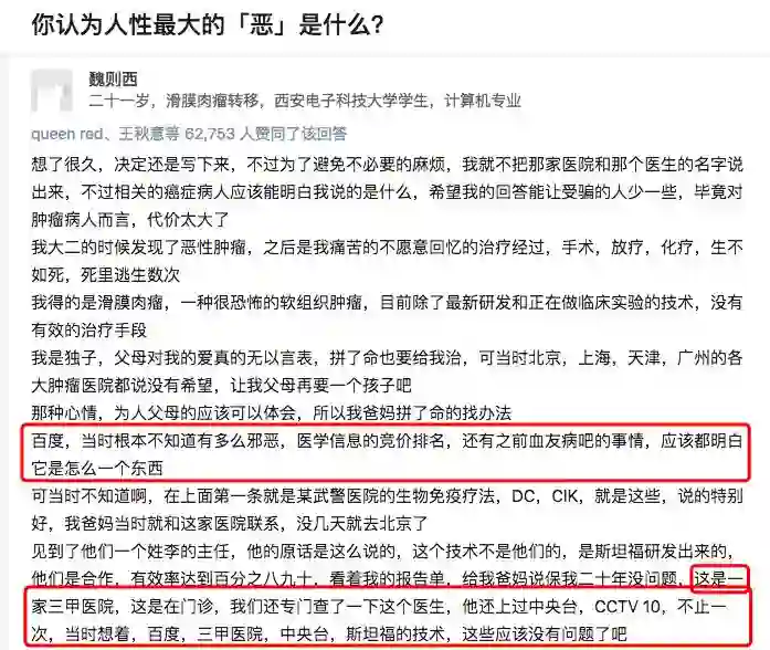 在回答中,魏则西写下“当时想着,百度,三甲医院,中央台,斯坦福的技术,这些应该没有问题了吧。”