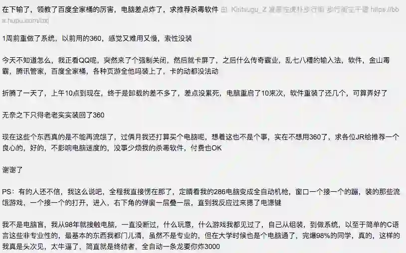 “当初为了下一个插件,手贱双击变成还是默认安装百度的东西,结果...百度软件大军30秒后进入战场,5分钟我的电脑被攻下,卡出翔来了”