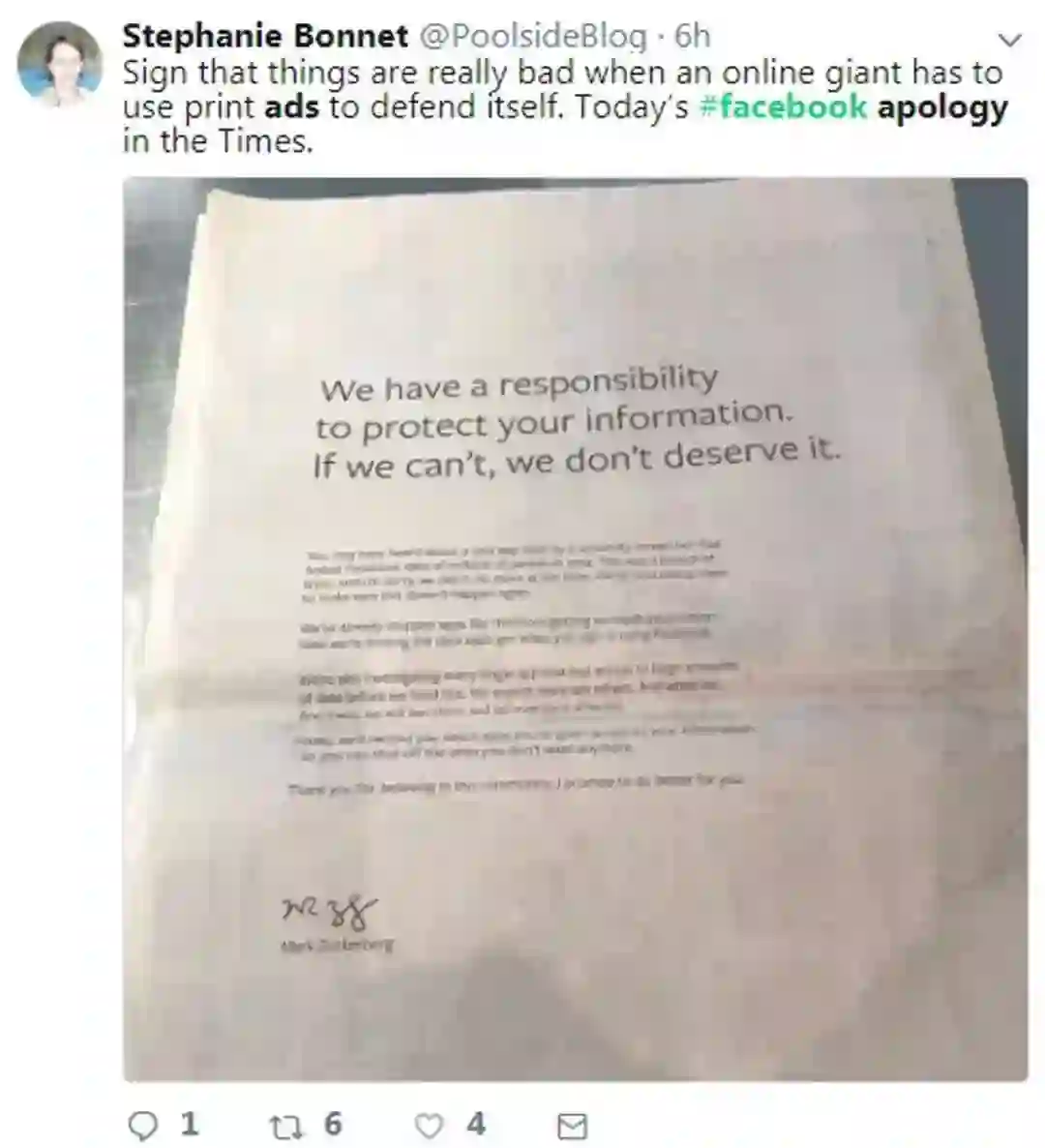 Facebook创始人兼CEO马克·扎克伯格周日在英国《观察家报》、美国《纽约时报》、《华盛顿邮报》、《华尔街日报》等报纸上登整版广告,就公司的“背信”行为道歉。