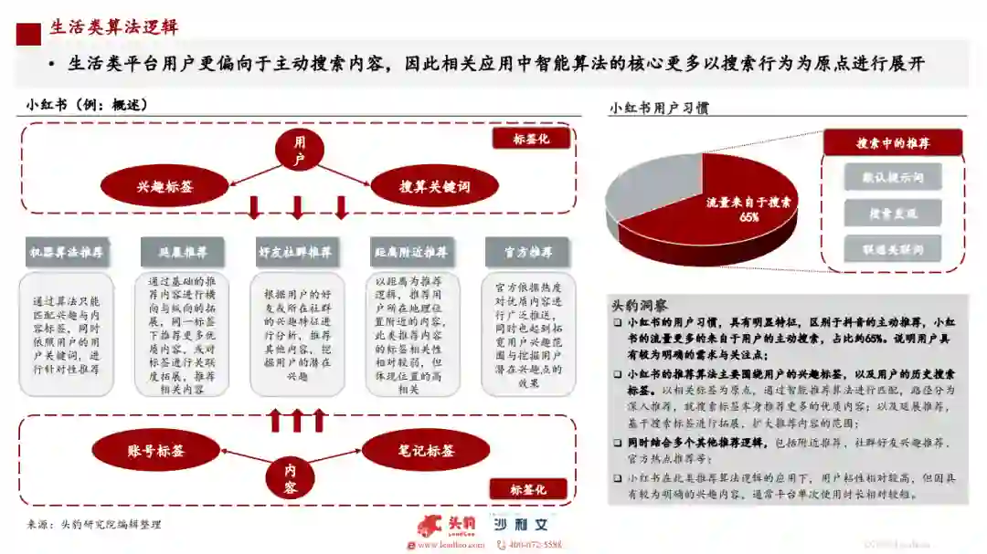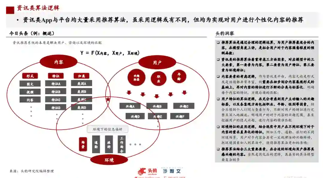 推荐算法是通过合理的逻辑运算,为用户推荐最适合的内容,在模型角度上讲,是拟合用户对于内容满意程度的预测函数。新闻资讯领域的推荐算法着重考虑三方面因素,对应模型中的三大要素,第一要素为内容,第二要素为用户特征、第三要素为环境特征:以抖音为代表的短视频领域,多以内容发布为起点,通过智能算法匹配到合适的用户,再根据反绩决定是否扩大内容的传播范围:生活类更多围绕用户的兴趣标签,以及用户的历史搜索标签进行关联推荐与深入推荐: