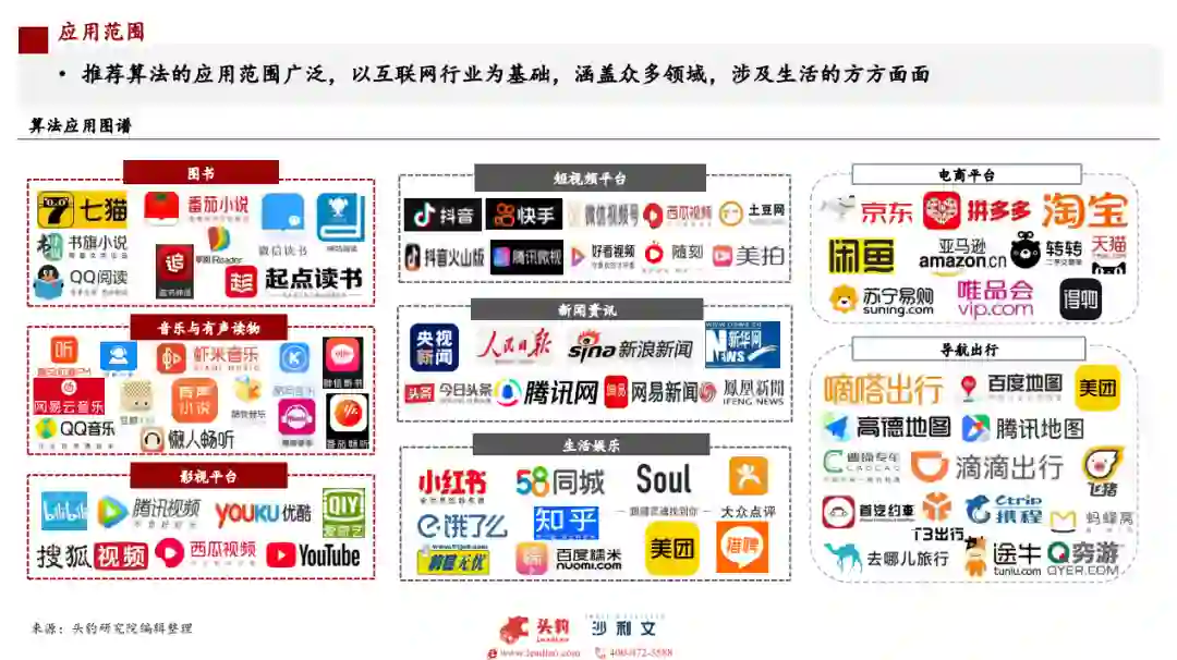 2012年至今,推荐算法进入了快速的技术革新阶段,也逐步依托技术带来的领先性能实现商业化落地,与互联网领域进行了深度的结合。2010年提出的FM技术在2012年成为主流的推荐算法,2014年的GBDT+LR更是带来了技木上的突破,2015年推荐算法由机器学习也正式转为深度学习。推荐算法也自此进入到各行各业,目前广泛应用于图书、音乐、视频、新闻、电影、地图、网购等等领域: