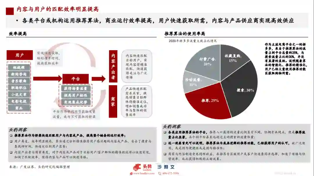 推荐算法作为桥梁快速匹配用户与内容或产品,提高整个链条的运行效率:用户角度,效率明显提高,算法通过分析精准推荐用户感兴趣的内容或产品,省去了搜索与查找得时间,快速定位到用户需要:内容产出者与商家角度,对于内容或产品对于目标用户/客户群体的精准投放得以快速实现,加快了匹配效率,使得内容与产品可以快速传播。