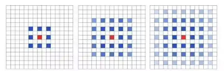一个简单的例子: dilation rate [1, 2, 5] with 3 x 3 kernel (可行的方案)
