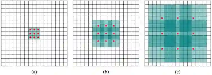 (a)图对应3x3的1-dilated conv,和普通的卷积操作一样,(b)图对应3x3的2-dilated conv,实际的卷积kernel size还是3x3,但是空洞为1,也就是对于一个7x7的图像patch,只有9个红色的点和3x3的kernel发生卷积操作,其余的点略过。也可以理解为kernel的size为7x7,但是只有图中的9个点的权重不为0,其余都为0。 可以看到虽然kernel size只有3x3,但是这个卷积的感受野已经增大到了7x7(如果考虑到这个2-dilated conv的前一层是一个1-dilated conv的话,那么每个红点就是1-dilated的卷积输出,所以感受野为3x3,所以1-dilated和2-dilated合起来就能达到7x7的conv),(c)图是4-dilated conv操作,同理跟在两个1-dilated和2-dilated conv的后面,能达到15x15的感受野。对比传统的conv操作,3层3x3的卷积加起来,stride为1的话,只能达到(kernel-1)*layer+1=7的感受野,也就是和层数layer成线性关系,而dilated conv的感受野是指数级的增长。
