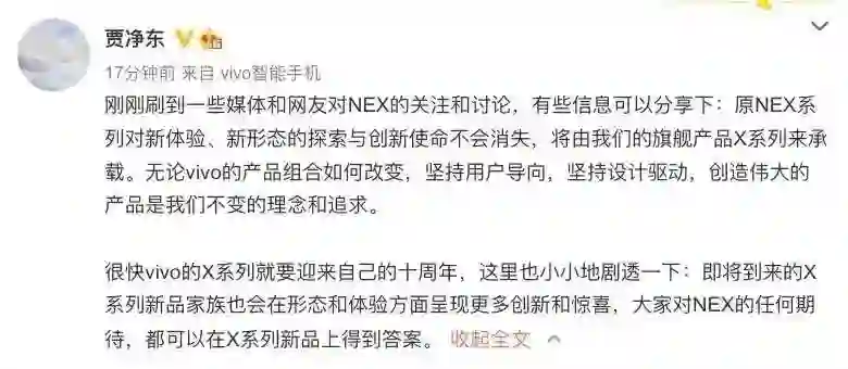 vivo 在近期的组织调整中撤销了NEX事业部。NEX是vivo 在2018年推出的高端手机品牌,首款产品起售价近4000 元,后逐步提升至5000 元及更高。vivo 品牌副总裁贾净东表示,NEX的使命将由X系列承载。(财经网)