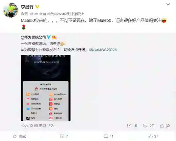 2月26日,华为消费者BG战略Marketing部副总裁李昌竹发微博确认:“Mate50会来的,不过不是现在。”此前,博主@菊厂影业 Fans在微博透露,就目前消息看,华为Mate 50系列将只有骁龙 8 处理器版本,只有 4G 版,大概在 7 月中下旬发布。(IT之家)