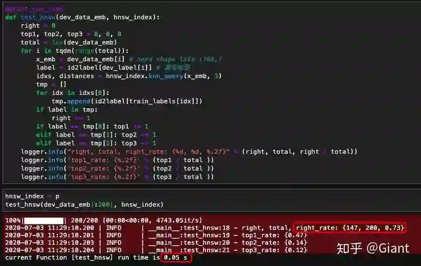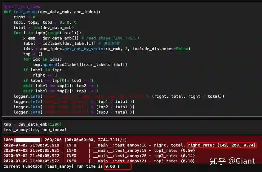最终,预测200条样本耗时0.05秒(0.25ms/条),速度优于annoy。