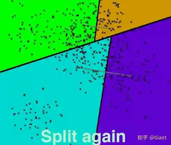 annoy的每一次空间划分,可以看作聚类数为2的KMeans过程。收敛后在产生的两个聚类中心连线之间建立一条垂线(图中的黑线),把数据空间划分为两部分。