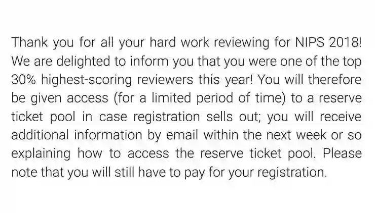 作为参照,谷歌大脑的研究人员 David Ha (@hardmaru)发出自己收到的邮件的截图(如下图)。他被评为了优秀审稿人,NIPS 也为他预留了门票,可以不用像普通参会者那样去抢。