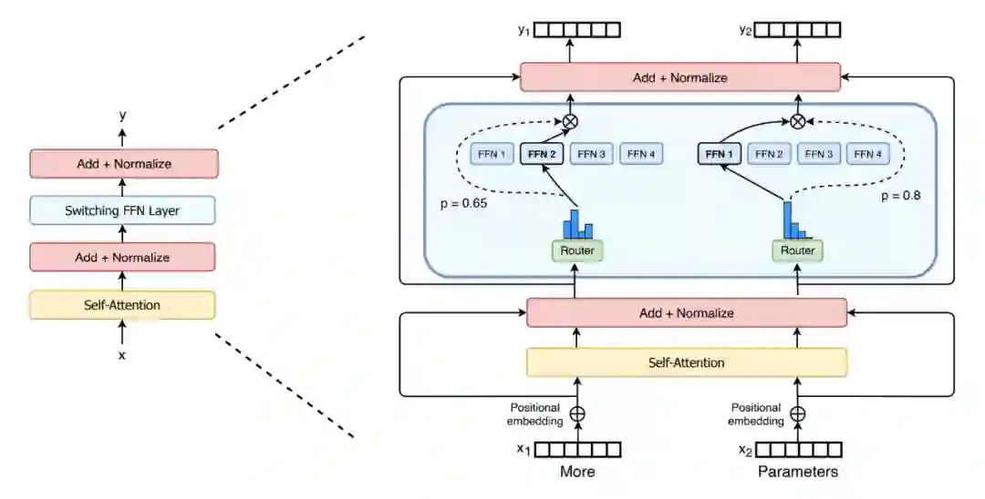 即在自然语言 MoE (Mixture of experts)层中,只将 token 表征发送给单个专家而不是多个的表现会更好。模型架构如上图,中间蓝色部分是比价关键的部分,可以看到每次 router 都只把信息传给分数 p 最大的单个 FFN。而这个操作可以大大降低计算量。
