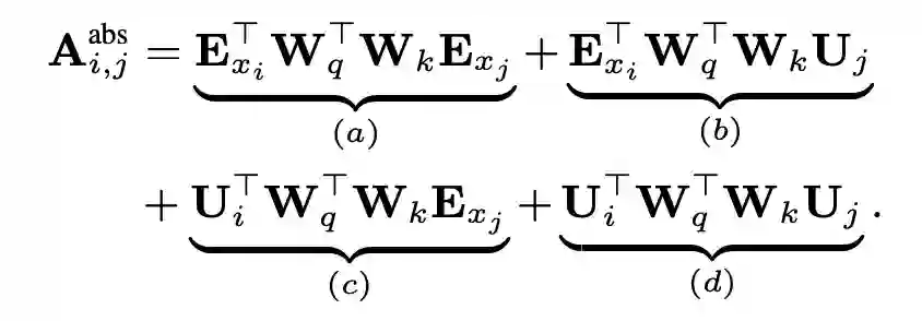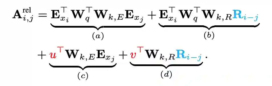上图是原始 Transformer 和 Transformer-XL 的比较,其中 E 表示词的 Embedding,而 U 表示绝对位置编码。这大一堆看起来奇奇怪怪,实际上 Transformer 的注意力计算是 的分解,即先编码 Q(当前词 i)和 K(其他的词 j)然后算内积,位置编码是直接 add 在词嵌入上面的。