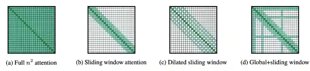 Sliding Window:如上图 (b) 所示,跟 CNN 很像,给定一个固定的窗口大小 w,其两边都有个 w/2 个 token 与其做 attention。计算复杂度降为 O(n x w),即复杂度与序列长度呈线性关系。而且如果为每一层设置不同的窗口 size 可以很好地平衡模型效率和表示能力。