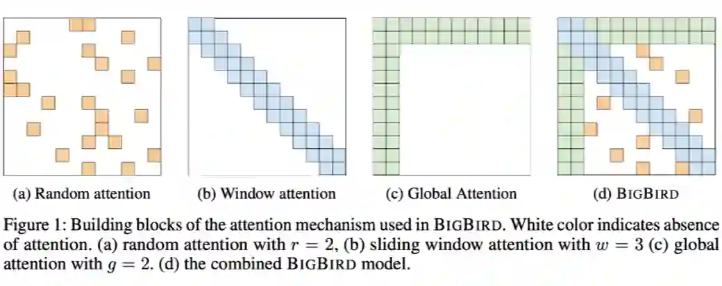 最后把这三部分注意力结合在一起得到注意力矩阵 A,如图 d 就是 BIGBIRD 的结果了,计算公式为: