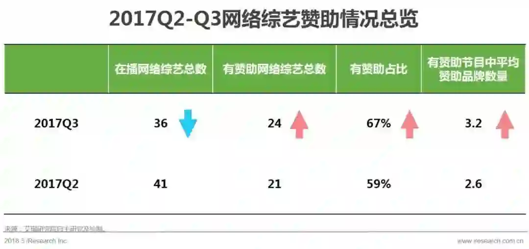 根据艾瑞咨询的监测,Q3一共有36部在播纯网综艺,其中24部网综有品牌赞助,约占67%,每个节目平均赞助品牌的数量为3.2个。