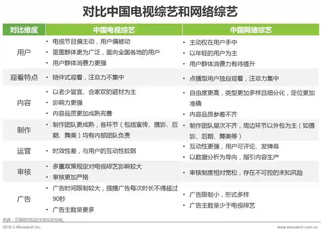 电视综艺制作团队成熟,品质高,广告主数量多,审核严格;网综互动性强,内容丰富,广告形式多样。随着政府对网络视频平台内容的监管加强,电视台综艺和网络综艺差异将逐渐降低。