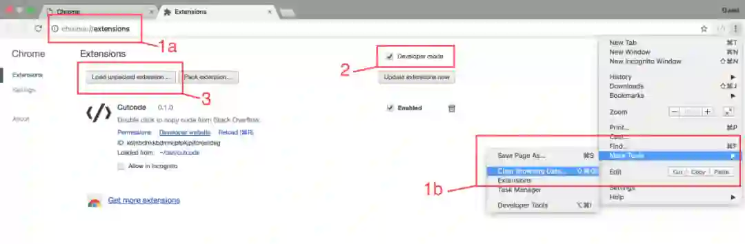 通过以下方式打开扩展页面:(1a)在导航栏输入「chrome://extensions」;(1b)选择「Menu > More Tools > Extensions」;