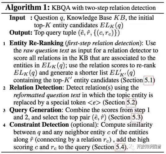 使用关系检测模型,可以进一步提高 KBQA 的准确率,主要的思路是在传统的实体连接-关系检测的两步过程中,使用关系检测的结果对实体连接的结果进行调整,具体算法如下所示