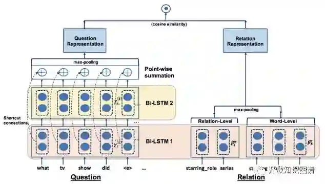 图中主要包含两个模块。如图所示,左半部分是问题的向量表示模块,主要的方法是使用 stacked BiLSTM 提取得到问题的不同粒度的表示,然后通过残差连接融合 stacked BiLSTM 中不同层次提取得到的隐藏层表示,最后通过 max pooling 得到定长的问题的向量表示。模型的右半部分是关系的向量表示模块,关系文本对应的 relation-level(整个关系文本作为一个t oken)表示和 word-level(关系文本中的每一个词语作为一个 token)表示分别被两个不同的 BiLSTM 处理,得到对应的隐藏层表示,之后通过 max polling 得到定长的关系表示。问题和关系的相似度可以使用问题向量表示和关系向量表示之间的余弦距离表示,训练的损失函数是 rank loss。