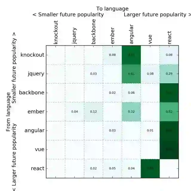细心的读者可能会问为什么 JavaScript 没有包含在分析中。原因是:(a)如果你在前端开发中使用它,那么你会一直坚持用下去,并没有转移的这个过程,除非你疯了,要做转译(transpiling,从一种编程语言到另一种编程语言的编译),这种情况太不常见了;(b)大家会把后端的 JavaScript 认作是 “Node”。