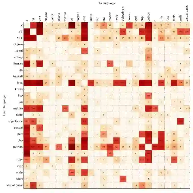 例如:从 C 语言转到 C# 的数量为 3619,从 C# 转到 C 的有 37229;