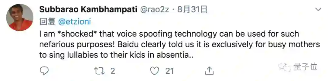 我很震惊语音技术会被用于这种邪恶的目的!百度不是明确的告诉过我们,语音技术是用来让忙碌的妈妈给娃唱摇篮曲的嘛?