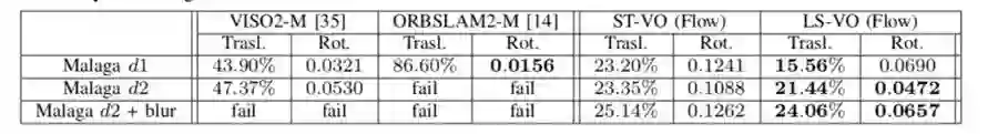 表三 关于Malaga实验的所有方法的表现总结。和表二中情况一样。 在这组实验中,为简单起见,仅分析了端到端架构。